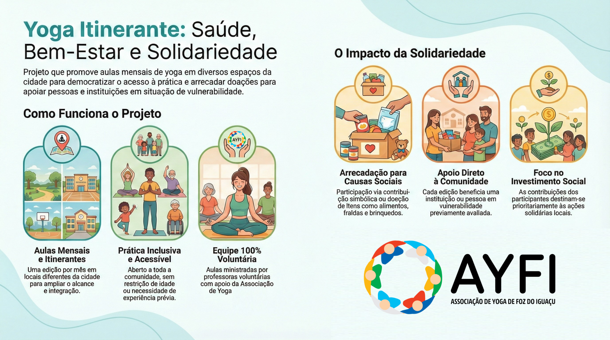 Cada edição do Yoga Itinerante estará vinculada a uma ação solidária, apoiando mensalmente pessoas, grupos ou instituições em situação de vulnerabilidade. As contribuições arrecadadas não têm caráter de remuneração, sendo destinadas prioritariamente às ações sociais definidas a cada encontro.